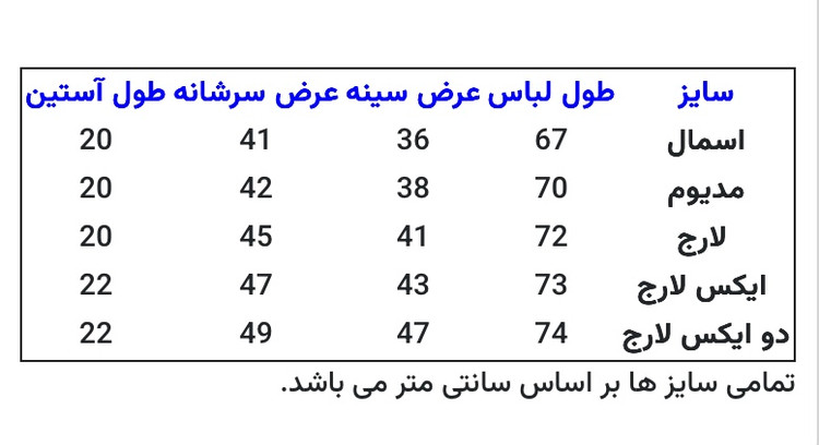 توجه: به راهنمای سایز بندی توجه فرمایید