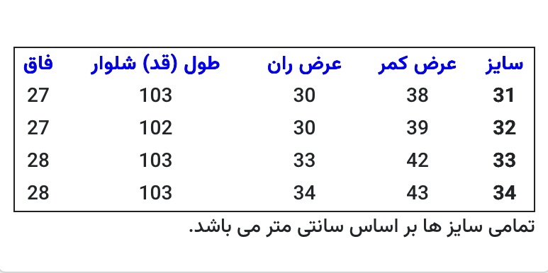 توجه: به راهنمای سایز بندی توجه فرمایید