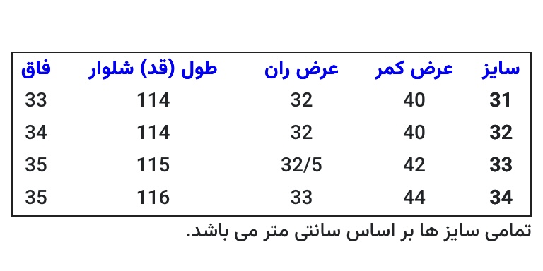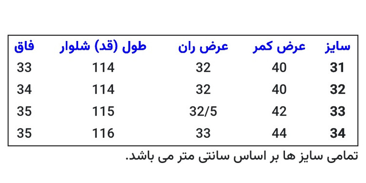 به جدول سایزبندی توجه نمایید